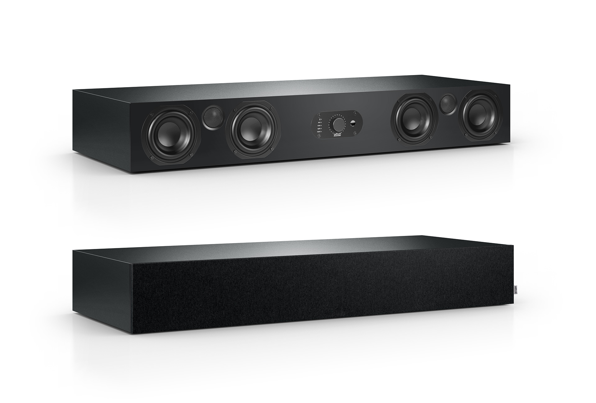 Die nuBoxx-Soundbase arbeitet als Stereosystem mit einem linkem und einem rechten Kanal. Die breite Schallwand begünstigt einen plastischen Bühneneffekt, der sich über die Integrierte Wide-Schaltung („Hörizonterweiterung“) weiter ausdehnen lässt. Speziell für Filme und Fernsehsendungen ist außerdem der Sprachfokus „Voice+“ an Bord, der eine deutlichere Stimmwiedergabe ermöglicht. Puristen können unverfälschten Zweikanalton genießen.>